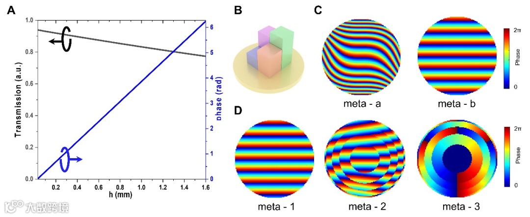 图2 可变焦超构器件的工作原理。(A) 超构天线的传输特性。(B) 超构天线的示意图。(C) 用于可变焦艾里光束的超构器件的相位设计。(D) 用于在三维空间中操纵焦点的超构器件的相位设计。