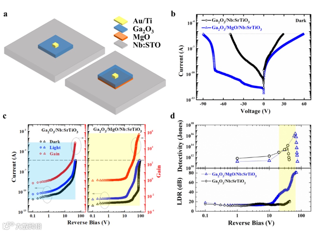 (a)Ga2O3/MgO/Nb:STO n-B-n单极势垒APD和Ga2O3/Nb:STO n-n型APD的器件示意图