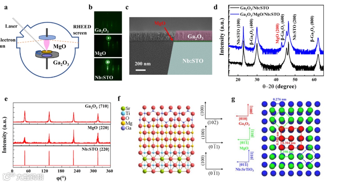 (a)Ga2O3、MgO和Nb:STO异质结构生长示意图。(b)RHEED图。(c)截面SEM图。(d) XRD θ-2θ扫描。(e) XRD Φ-scan。(f)横截面异质结构的原子排布图。(g)界面氧原子排布图。
