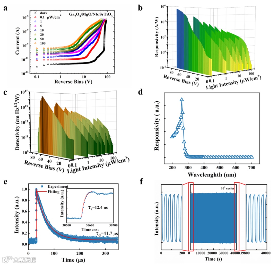 (a)n-B-n单极势垒APD在黑暗和不同强度254 nm光照条件下反向偏压I-V特性。响应度(b)和比探测率(c)随着光强和反向偏压变化的图像。(d)反向偏压下的光谱响应。(e)瞬态响应曲线;插图为放大的上升沿。(f) n-B-n单极势垒APD在104次光开关循环中的稳定性测试。