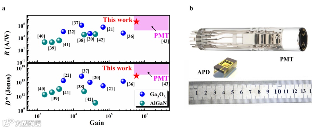 图5. Ga2O3/MgO/Nb:STO n-B-n单极势垒型雪崩探测器与迄今报道的雪崩光电探测器和光电倍增管的性能比较。a)响应度,比探测性及增益对比。(b)尺寸、结构和集成兼容性方面比较。