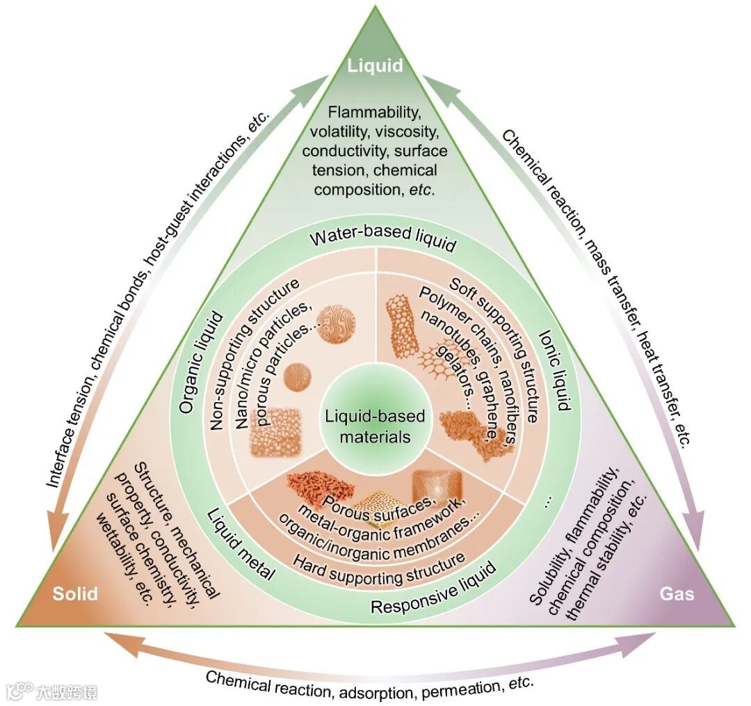 作者还列举了近年来各种液基材料的发展,如水凝胶、离子液体基材料、液态金属基材料、液基超滑表面、液体门控膜等。这些液基材料在能量转换与储存、废水处理、多相分离、物质吸附与捕集、特种涂层、智能柔性系统等领域越来越受到关注。在适应性、防污、防冰、防雾、自愈、无缺陷、界面传输效率高等显着优势。