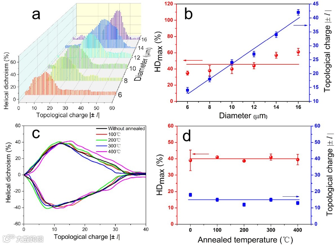 作者进一步研究了铜螺旋结构直径尺寸对其涡旋二色性信号的影响,由图4a,b可知,当铜螺旋直径从6 µm增加到16 µm,涡旋二色性谱图的正响应信号峰值略微增加,但基本维持在50%附近,而拓扑荷数则呈线性增加趋势,这也说明铜螺旋直径尺寸因素会对其涡旋二色性信号产生一定的影响。考虑到未来实际服役环境中可能出现的高温条件,进一步考察了直径8 µm铜螺旋在经100-400℃热处理后的结构及涡旋二色性响应的稳定性。结果表明,在保护气体中经历100-400℃热处理后,铜螺旋微结构依旧保持较好的三维结构及表明光滑度,具体可参阅论文中的补充材料;对于涡旋二色性的测试结果,相较于未经热处理的铜螺旋,100-400℃热处理后涡旋二色性谱图的变化很小,相应的涡旋二色性峰值及其峰值所对应的拓扑荷数值波动幅度很小。这种在三维结构及手性光响应信号上的出色的稳定性,使得铜螺旋微结构作为未来手性光学检测超材料具有极大的应用前景。