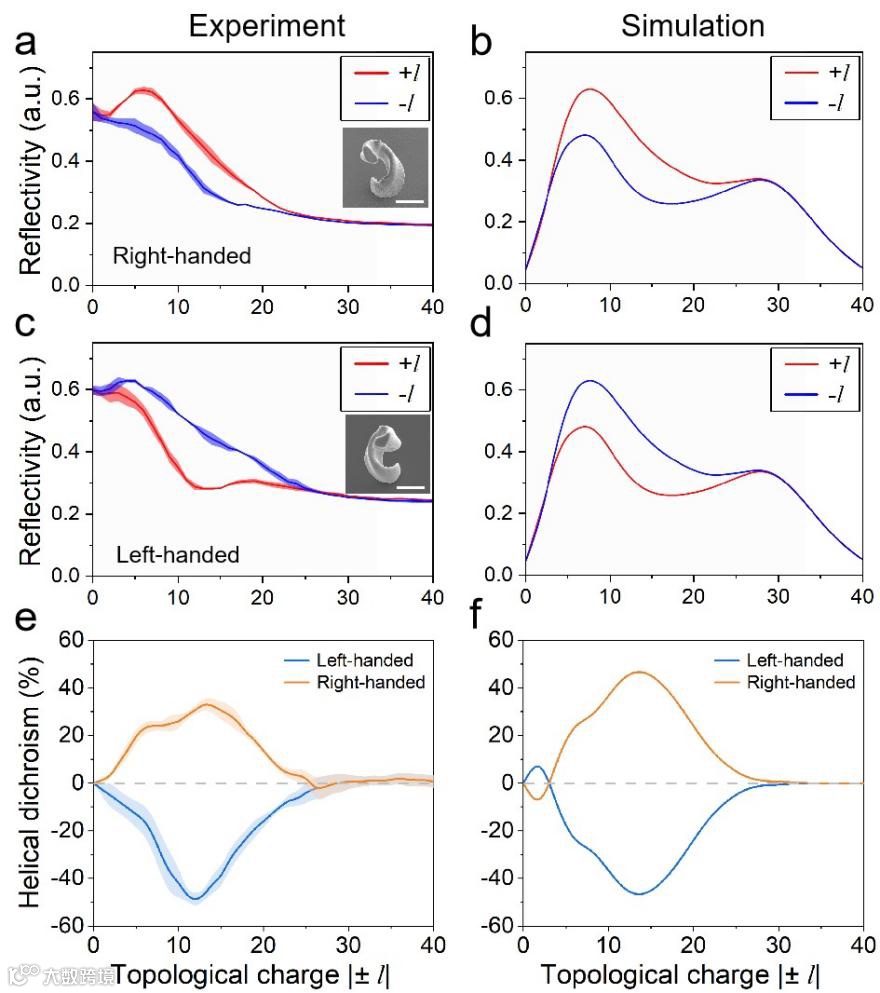 图3. 直径6 µm手性铜螺旋结构在光子轨道角动量下产生的手性光学响应的实验结果及仿真结果