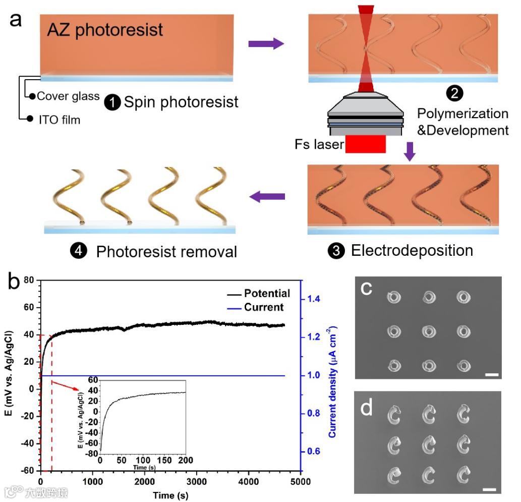 图1 飞秒激光加工结合电化学沉积制备三维手性铜微螺旋结构,(1)正性光刻胶旋涂于ITO,(2)飞秒激光加工制备螺旋微孔道,(3)电化学沉积铜微螺旋,(4)多余光刻胶的去除