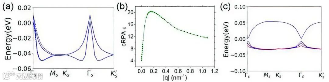 图2 (a)包含高能子空间库伦势能效应的平带色散,(b)考虑库伦屏蔽效应后介电常数随波矢的关系,(c) ν=3填充处的相互作用单粒子能谱
