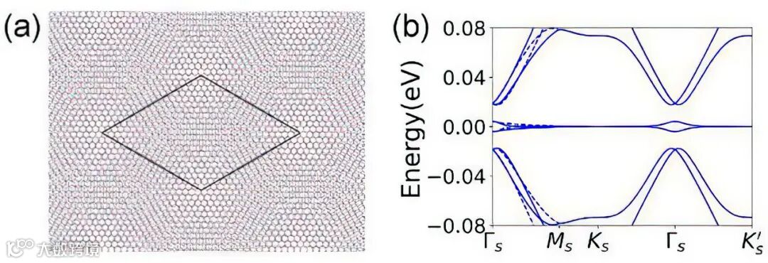 图1 (a) 转角双层石墨烯体系摩尔超晶格示意图,(b)及其非相互作用能带