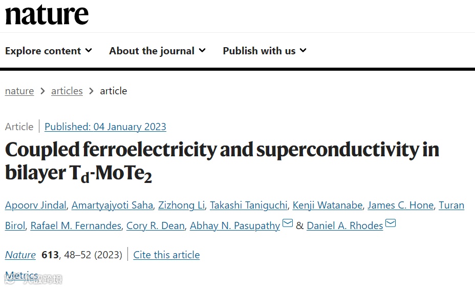 但是出现了超导与铁电性共存的材料!威斯康星大学Daniel A. Rhodes团队和哥伦比亚大学Abhay N. Pasupathy团队在半金属化合物二碲化钼(MoTe2)超薄薄片这种超导化合物中发现了铁电性,这种特性可以用来开启和关闭该材料的超导性。相关成果以“Coupled ferroelectricity and superconductivity in bilayer Td-MoTe2”发表于最新一期Nature。