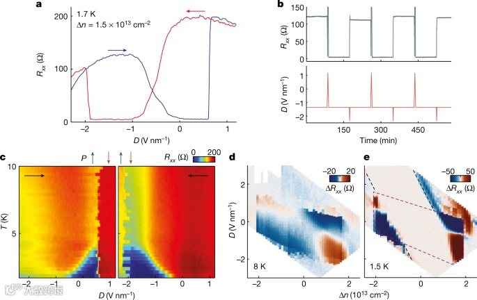 研究进一步发现,超导性和铁电性之间是紧密耦合的。当外部电场切换时,材料将突然从零电阻的超导体变为具有非零电阻的普通金属。受极化方式影响,转换是相对稳定不易失去的,换句话来说,MoTe2 在施加电场脉冲时从超导体转变为普通金属,并无限期地保持这种状态,直到施加下一个脉冲。