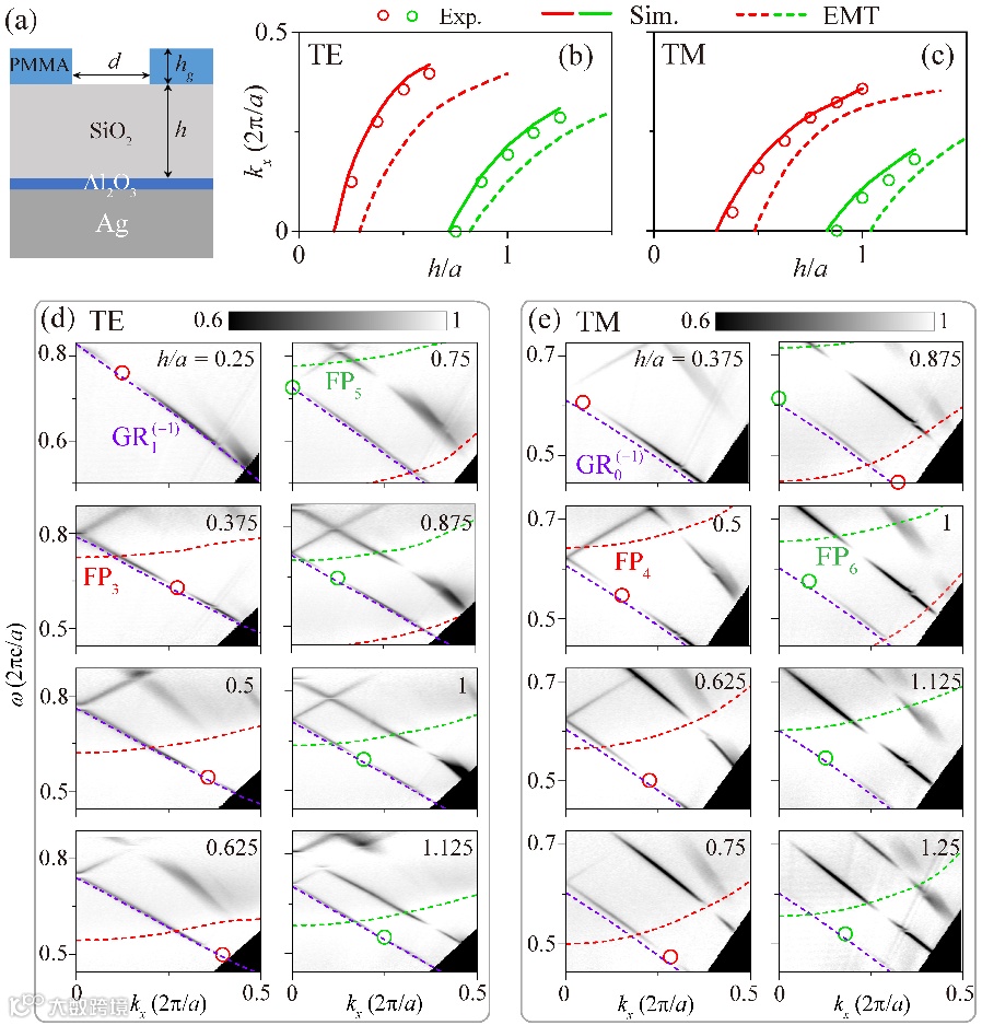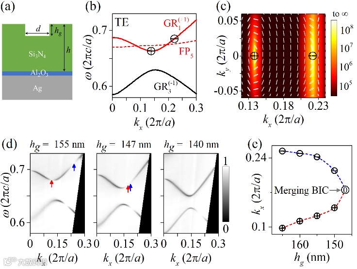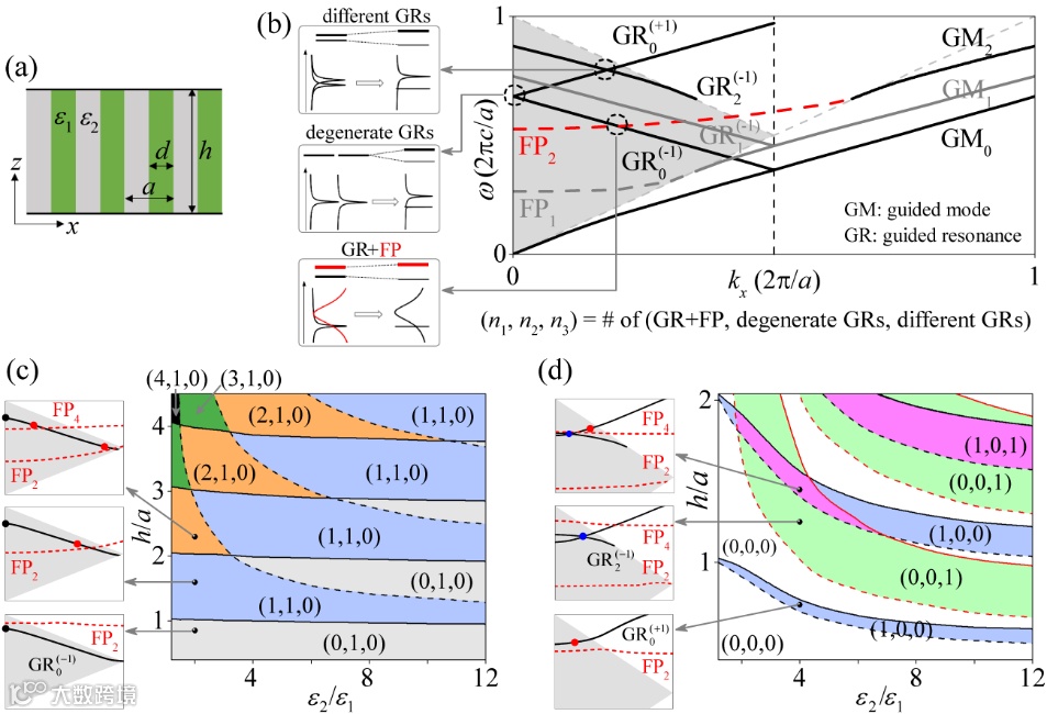 图1. 光子晶体平板中BIC的全局相图。(a) 光子晶体平板的示意图。(b) 光子晶体平板的能带结构示意图。插图表示具有三种不同Friedrich-Wintgen起源的BIC:GR+FP,简并的GR模式,不同的GR模式。(c, d) TE偏振下