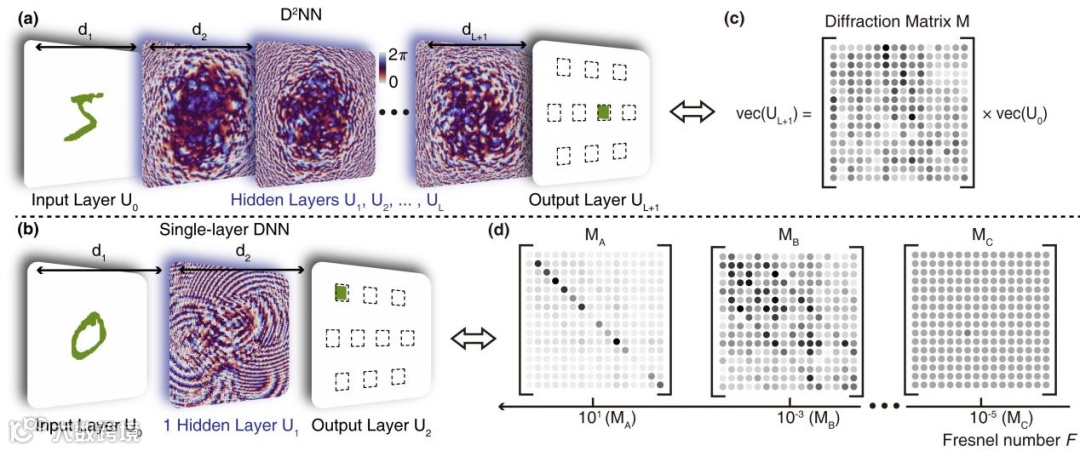 图1 (a)深度和(b)单层衍射神经网络(DNN)框架示意图。(c)整个衍射和多层相位调制过程可以看作是衍射矩阵M的矩阵乘法。(d)不同菲涅尔数的单层衍射神经网络的衍射矩阵可以用MA(~101)、MB (~10-3)和MC (~10-5)表示。