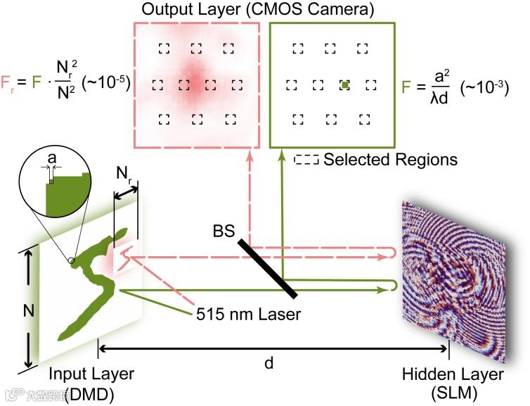 研究团队引入了一种新的方法,通过控制描述衍射效应的菲涅尔数(由衍射元件尺寸,工作波长和衍射距离决定)来设计D2NN。只需要使实验参数达到最佳的菲涅尔数区间内,衍射神经网络的性能会达到最佳,可以最大程度上减少网络的空间复杂度(如图1)。