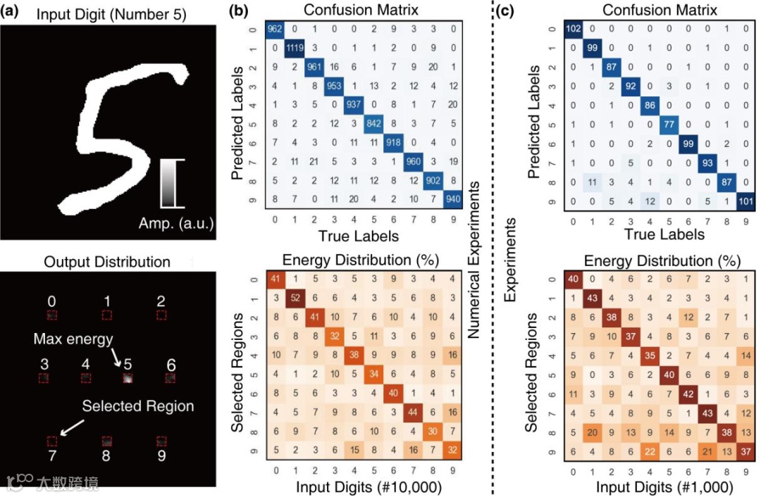 图3 (a)MNIST手写输入数字图像。在输出平面上分别设置十个光强检测区域,强度之和最大的检测区域显示预测答案。(b)数值模拟测试集10000张图像的数值测试结果,达到了最大94.94%的正确率。(c)在实验中,测试集使用1000个不同的手写数字作为输入,达到了92.70%的正确率。