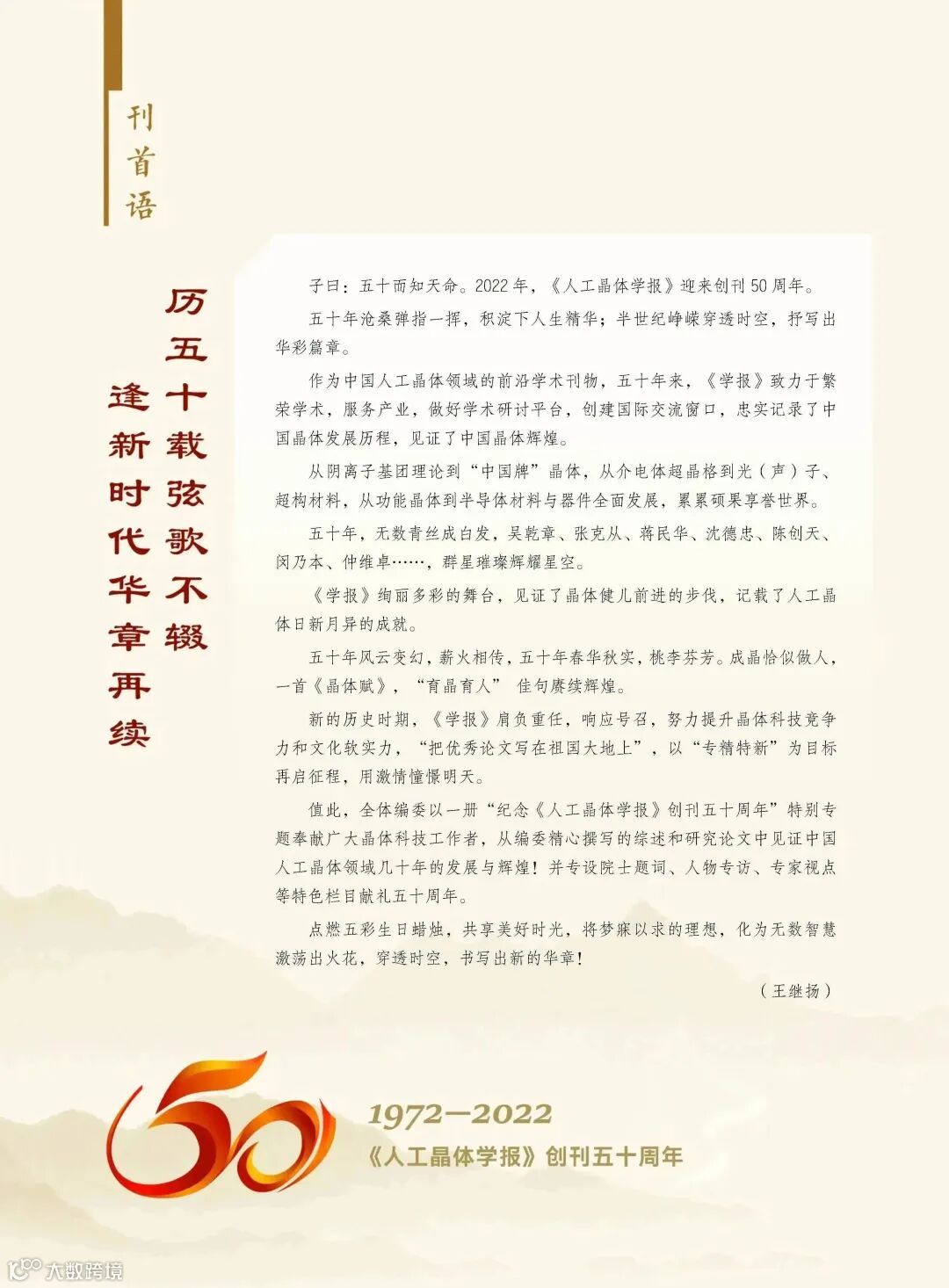 子曰:五十而知天命。2022 年,《人工晶体学报》迎来创刊50 周年。