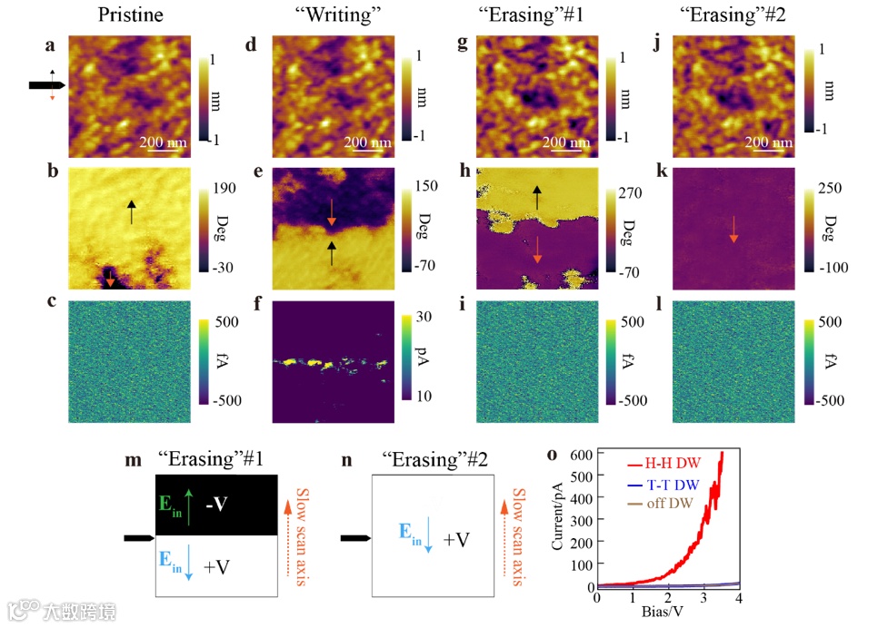 图2. BaTiO3/Si中铁电畴壁导电性的可擦写调控。(a-c) 读取样品本征状态。(d-f)“写入”导电畴壁。(g-n) 两种不同的方式“擦除”导电畴壁。(o) 不同畴壁状态下的电流-电压曲线。