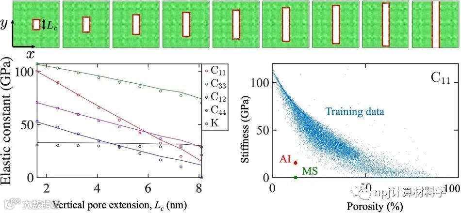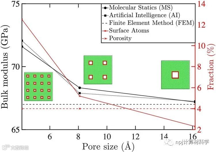来自德国马普学会微观结构物理和合金设计研究所的Jaber Rezaei Mianroodi等,提出了一种无损且有效的方法,使用人工智能技术来研究具有复杂纳米结构得材料弹性响应问题。他们将纳米多孔材料的结构图像作为输入,将原子模拟直接计算的弹性张量作为输出,训练了卷积神经网络模型。经过原子数据训练后的模型,可以直接从原子尺度捕获表面和尺寸效应,并且实现了从微观尺度到宏观尺度的无损转移。研究发现,经过训练的卷积神经网络可以捕获完整原子细节(如孔隙表面效应),同时比原子计算快几个数量级。