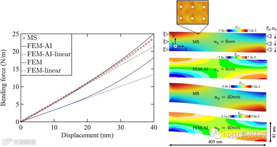 摘要 迄今,材料弹性响应的本构描述在原子尺度和连续尺度之间的无缝和无损转换一直难以捉摸。在这里,我们展示了如何通过使用人工智能(AI)来克服这个问题。我们通过将纳米多孔材料的结构图像作为输入,将从分子静力学(MS)计算的相应弹性张量作为输出,训练了卷积神经网络(CNN)模型。通过原子数据训练,CNN模型捕获了材料弹性性质的尺寸和孔隙依赖性。从物理方面来说,该特性来源于其固有刚度以及表面弛豫和非局域效应。为了验证训练后CNN模型的正确性和效率,我们针对弹性变形纳米多孔梁,将包含CNN作为本构定律的有限元法(FEM)结果与全原子模拟结果进行了比较。与原子计算相比,训练后的CNN模型预测的测试数据集的弹性张量均方根误差为2.4GPa(体积模量的3%)。另一方面,CNN模型比MS计算快约230倍,且不需要在不同尺度间改变模拟方法。CNN评估的效率,加上重要原子效应的保留,使该训练模型成为纳米多孔材料宏观模拟、纳米结构优化、逆问题求解的有效原子信息本构模型。