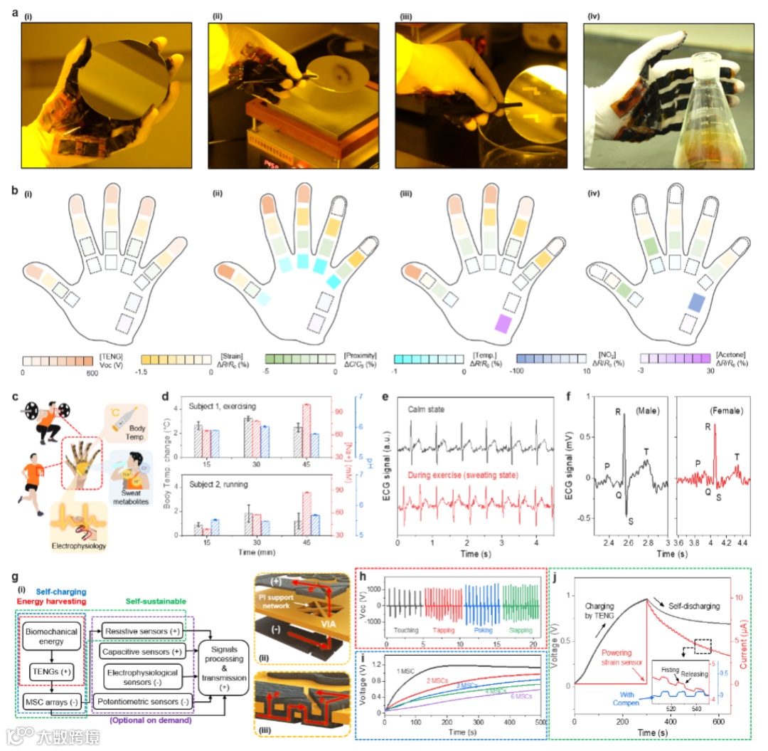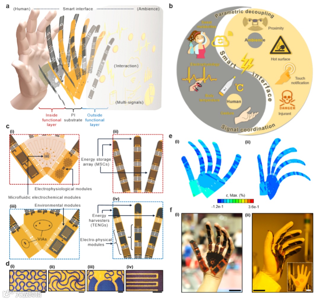进一步地,得益于激光直写电极的高导电性、高表面积及高参数可调节性,课题组优化了各传感模块的制备工艺以保证工艺的可重复性及模块间性能的均一性。基于上述设计,各传感模块间相同配合/协同使整个体系充当了人体生理指标反馈与周围环境因子感知的桥梁。除了传感界面处的复杂信号,系统还集成了界面能量采集模块,降低了系统对外界能量供给的依赖并拓宽了系统的应用情景(图2)。