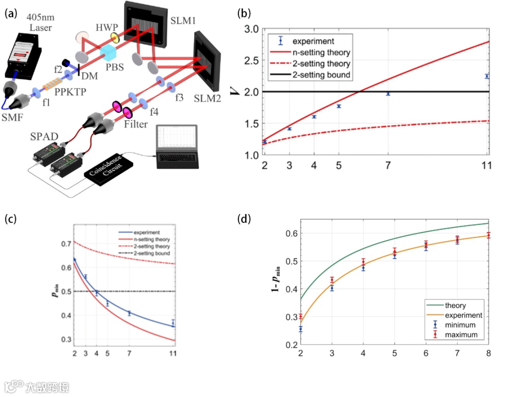(a) 双光子高维导引实验装置图 (b) 对导引不等式的违反程度
