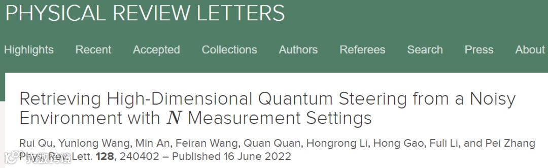 近日,西安交通大学物理学院张沛教授研究组开展了噪声环境下的高维量子导引特性的实验研究。相关研究成果于以《使用多测量设置从高噪声环境中提取高维量子导引特性》(Retrieving high-dimensional quantum steering from a noisy environment with N measurement settings)为题在物理学顶级期刊《物理评论快报》(Physical Review Letters)发表。该论文第一作者为物理学院博士研究生瞿睿,通讯作者为物理学院张沛教授,物质非平衡合成与调控教育部重点实验室为本论文第一单位和唯一通讯单位。