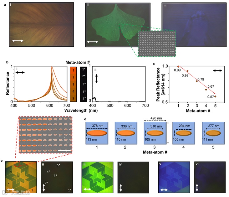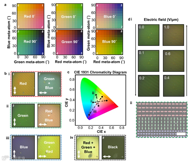 图1. 椭圆形元原子与 LC 相结合,实现电可调结构颜色。