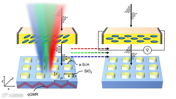 在传统显示器中,液晶(LC) 多年来一直是色彩再现的关键组件。它们的多功能性也导致了与超表面结合的许多应用,用于电可调活性纳米光子器件,包括结构颜色的示例。但对于基于活性超表面的结构颜色,仍然需要实现明亮、饱和的颜色以及深黑色状态。此外,管理明暗之间的间歇状态对于允许生成颜色渐变以通过访问整个色域来产生逼真的结果至关重要。到目前为止,这些功能尚未在单个可调超表面中实现。此外,使用LC 的可调谐结构颜色的示例依赖于等离子体超表面,其在蓝色波长处遭受不可避免的欧姆损失,限制了它们在这些波长上的适用性,并且黑色状态只能通过使用辅助偏振器来阻挡偏振与超表面相互作用后的光。