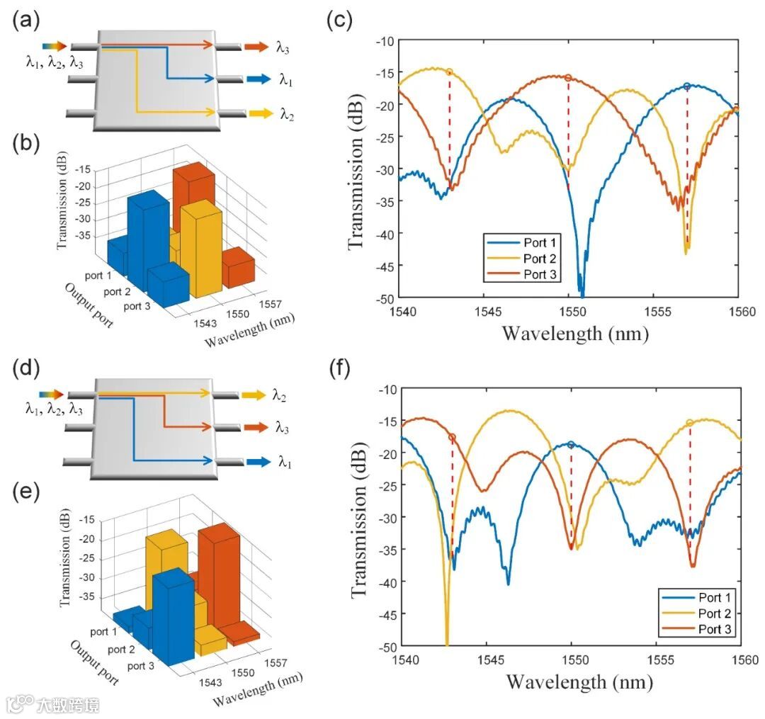 图5. 用于可调WSS的光子仿真器。(a)和(d)是两种不同路由情况下的可调波长选择模型。(b)和(e)是三个不同波长在三个输出端口中的传输情况。(c)和(f)是三个输出端口从1540到1560 nm的光谱。