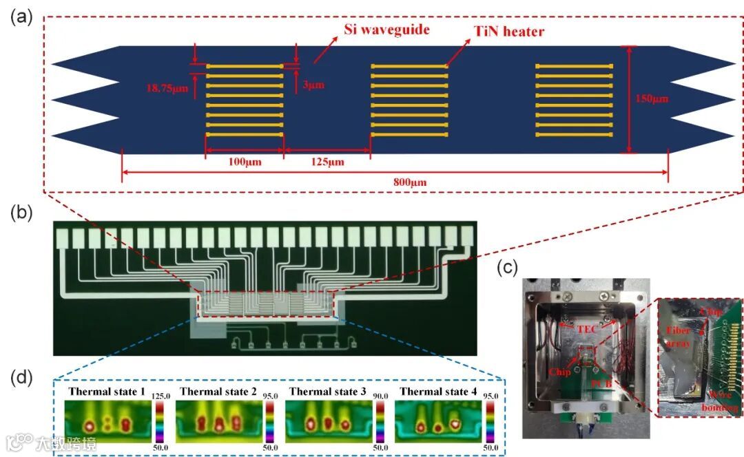 图2. 光子仿真器的设计。(a)光子仿真器示意图。(b)光子仿真器芯片的显微镜图像。(c)封装芯片的整体照片。(d)施加特定电压时芯片的热分布。