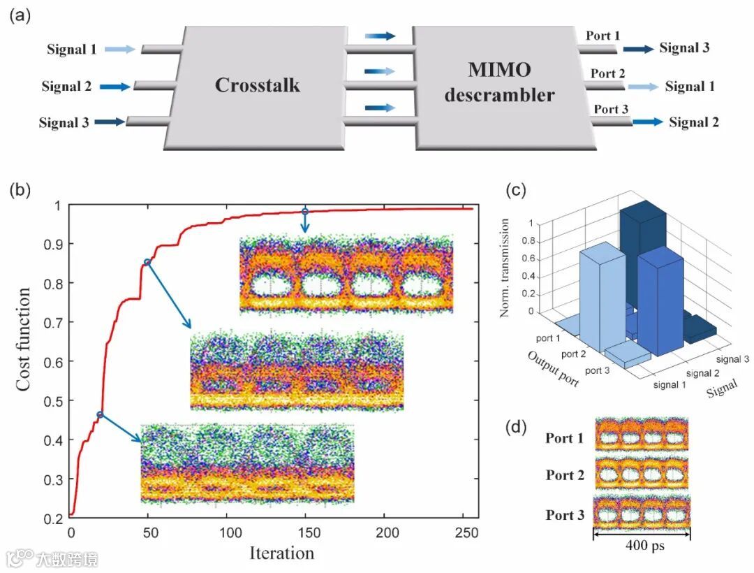 图3. 用于三端口光MIMO解扰器的光子仿真器。(a)三端口光MIMO解扰器模型。(b)CF与训练迭代以及迭代次数等于20、50和150时输出端口3的相应眼图。(c)MIMO结构的归一化传输情况。(d)端口1、2和3的最终输出眼图。
