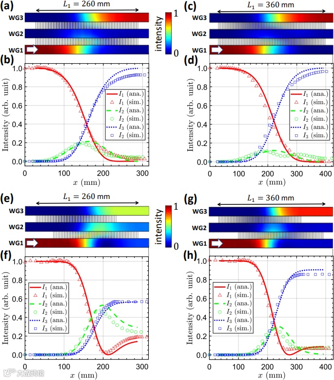 不仅如此,还将绝热捷径技术应用至声学系统中,提出了一种紧凑型声学波导耦合器的设计方式。通过与传统受激拉曼绝热过程所设计的声学波导耦合器对比,验证了该方法可以极大缩短器件长度而不影响能量输运效率。与此同时,得益于绝热捷径技术良好的鲁棒特性,利用Hadamard变换实现了具有宽带响应的单向声学分束超构材料 [3]。