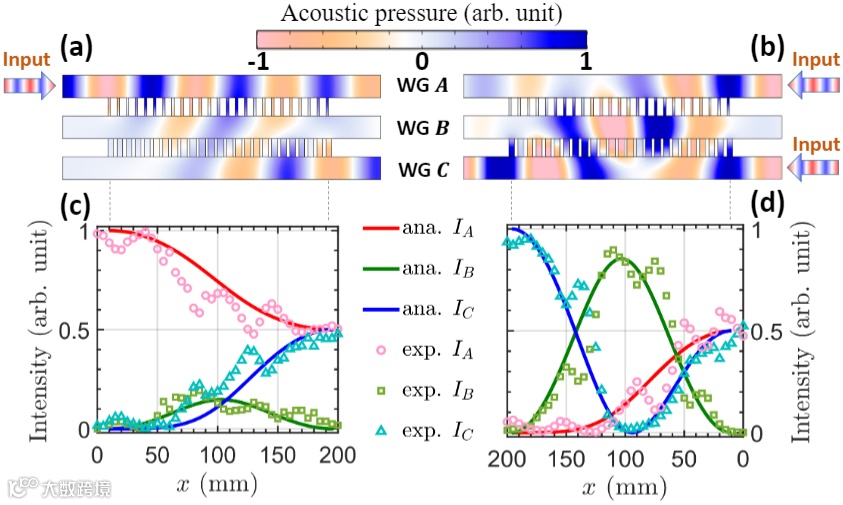 然后,利用反向部分受激拉曼绝热过程在声学系统中的类比,实现了具有入射相位依赖特性的三波导声学耦合器,并结合具有入射波长选择特性的相位转换器构建了双功能声学超构材料,在两个独立的工作频率下,完成了对分裂声束和聚焦声束的解耦调控[2]。