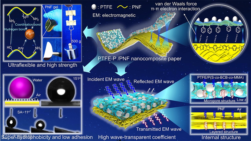 本工作近期以“High-strength super-hydrophobic double-layered PBO nanofiber-polytetrafluoroethylene nanocomposite paper for high-performance wave-transparent applications”为题发表于Science Bulletin(2022, 10.1016/j.scib.2022.10.011)上。第一作者为西北工业大学化学与化工学院唐林博士生,通讯作者为西北工业大学化学与化工学院顾军渭教授和南洋理工大学周琨教授。本研究工作得到了技术领域基金项目、凝固技术国家重点实验室(西北工业大学)开放课题(SKLSP202103)、高分子电磁功能材料陕西省“三秦学者”创新团队以及2021年度博士论文创新基金(CX2021036)的资助和支持。