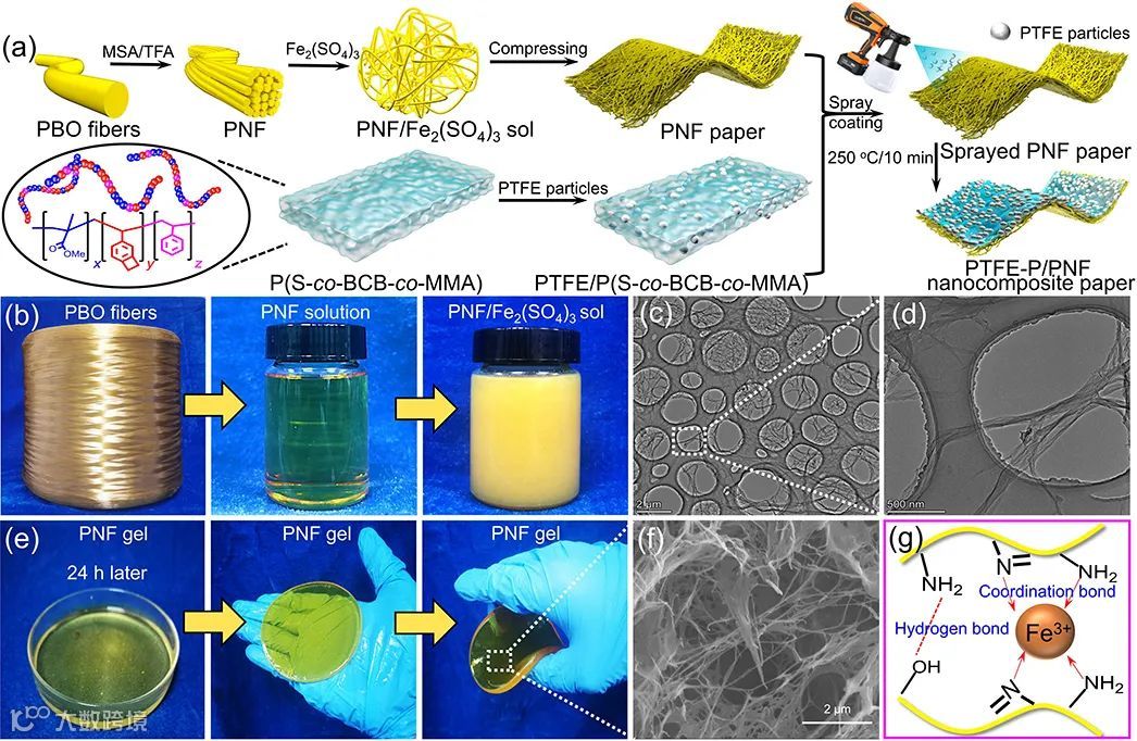 Fig. 2. Schematics of the Preparation for PTFE-P/PNF Nanocomposite Paper, and Exfoliation of PBO Fibers into PNFs. Schematics of the preparation for PTFE-P/PNF nanocomposite paper and exfoliation of PBO fibers into PNFs. Schematic diagram of the preparation for PTFE-P/PNF nanocomposite paper (a); process of converting PBO fibers into PNF/Fe2(SO4)3 sol (b); TEM images of PNF (c, d); optical photographs of PNF gel with certain flexibility (e); SEM image showing the inside of the PNF gel (f); schematic diagram of the interaction mechanism between PNFs (g).