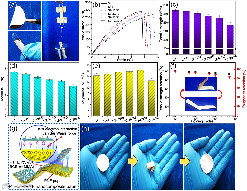 Fig. 4. Mechanical properties and folding resistance of PTFE-P/PNF-50/50 nanocomposite paper. Optical photographs of the PTFE-P/PNF-50/50 nanocomposite paper possessing ultraflexibility and withstanding a weight of 500 g (a); tensile stress-strain curves (b), tensile strength (c), modulus (d), and toughness (e) of the PNF, P/PNF and PTFE-P/PNF nanocomposite paper; tensile strength and toughness retention of the PTFE-P/PNF-50/50 nanocomposite paper after repetitive folding (f); schematic diagram of the mechanism of interactions between the PTFE/P(S-co-BCB-co-MMA) and the PNF paper for fabricating the PTFE-P/PNF nanocomposite paper (g); optical photographs of the PTFE-P/PNF-50/50 nanocomposite paper being continuously folded and unfolded, showing no breakage (h).