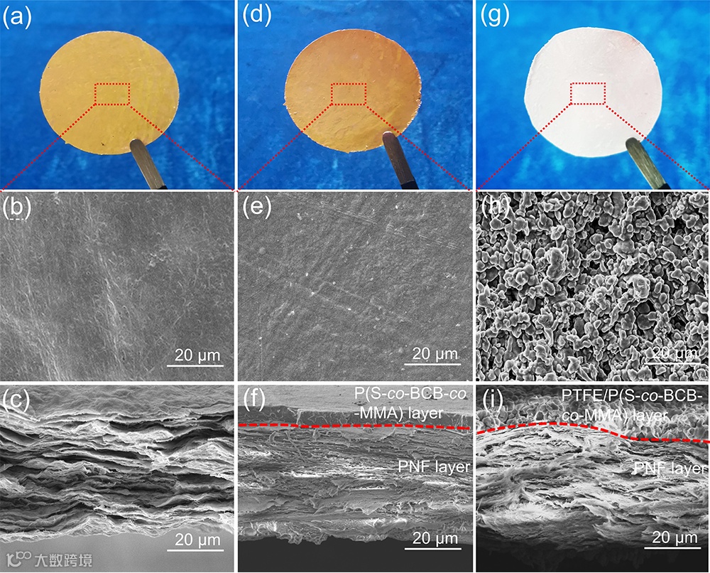 Fig. 3. Morphology of PNF, P/PNF and PTFE-P/PNF-50/50 nanocomposite paper. Optical photographs of PNF (a), P/PNF (d), and PTFE-P/PNF-50/50 nanocomposite (e) paper; SEM images of PNF (b), P/PNF (e), and PTFE-P/PNF-50/50 nanocomposite (h) paper; SEM images of fracture surfaces for PNF (c), P/PNF (f), and PTFE-P/PNF-50/50 nanocomposite (i) paper.