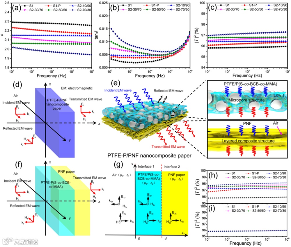 Fig. 5. Dielectric and wave-transparent performances of the PTFE–P/PNF nanocomposite paper. Dielectric constant ε (a), dielectric loss tangent tanδ (b), and wave-transparent coefficients |T|2 of the wave-transparent model for a single-layer dielectric (c) of the PNF, P/PNF, and PTFE-P/PNF nanocomposite paper; wave-transparent model of a single-layer dielectric (d); diagram of electromagnetic wave transmission (e); wave-transparent model of a double-layered dielectric (f,g); |T|2 values of the wave-transparent model for a double-layered dielectric with the incident surface being the PNF paper (h) and PTFE/P(S-co-BCB-co-MMA) layer (i).
