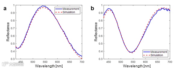 图4 MASR系统测量的实验结果。(a) 通过MASR系统获得的SiO2的结果,均方根误差(RMSE)=0.0015(参考:494.4nm)。(b) RMSE=0.0022(参考:392.1nm)的MASR系统获得的SiO2的结果(参考:392.1nm)。