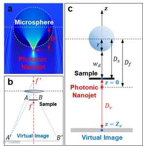 近年来,新兴的微球辅助纳米镜已经被证明可以用来观察超过瑞利极限的纳米结构,微球半径一般为1–50µm,通常由透明和介电材料制成。光子纳米射流效应等理论模型描述了微球如何在高分辨率的前提下放大物体并克服光学限制,光子纳米射流是在微球远侧产生的电磁束,它能够将倏逝波转换为传播波,这是关于微球超分辨率的主要理论之一。尽管超分辨率的确切机理尚不清楚,但微球辅助超分辨率技术可以实际应用于各种光学测量系统,如干涉测量和共焦显微镜。