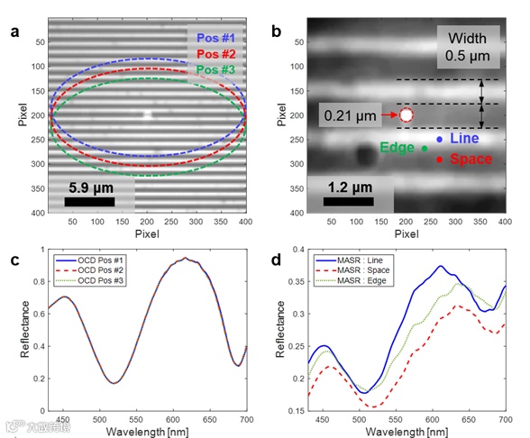 图5 MASR系统获得的极小光斑的光谱测量。0.5μm线宽和1μm间距光栅图案以及反射率测量区域,用于(a) 100X图像中的光谱椭偏仪,其长轴上有一个25μm的光斑,用于三个不同位置,以及(b) 由微球和相关位置获得的约530X超分辨率图像。(c) 在(a)中位置的椭偏仪的光谱反射率。(d) 在(b)中位置的MASR系统的光谱反射率。