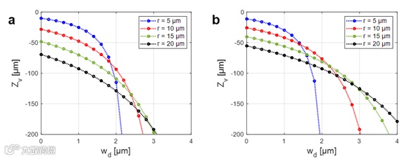 图3 半径为5、10、15和20µm的微球轴向位置的模拟结果。(a) SLG(n=1.52和λ=524nm)和(b) PS(n=1.60和λ=524 nm)。n表示特定波长λ的折射率。