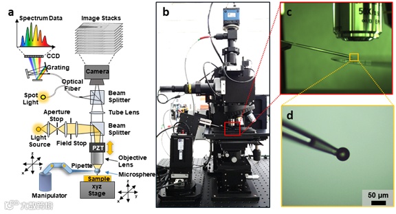 图1 (a) 基于传统显微镜配置的MASR系统示意图。使用白光发光二极管(LED)作为光源。光依次照亮物镜、微球和样品。来自样品的反射光在图像传感器和光栅之间分离,以捕获图像和分析光谱数据。(b) 将微球置于物镜下的成像光学。(c) 移液管上的微球由微操作器控制。(d) 连接到移液管的微球的放大图像。