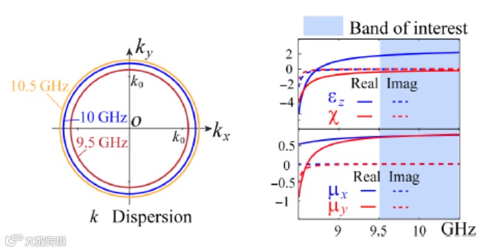 图3.变形的SRR谐振环超构媒质及其空间色散与电磁参量。