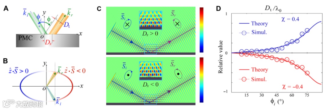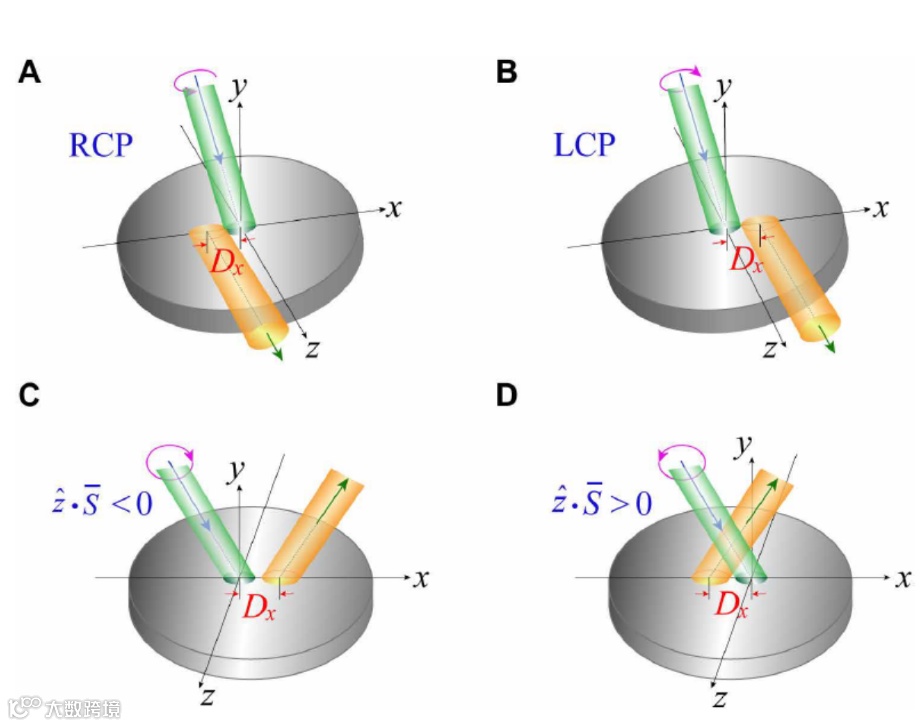 图1. A-B 自由空间圆极化波的I-F位移;C-D 横向自旋极化波的自旋霍尔位移。