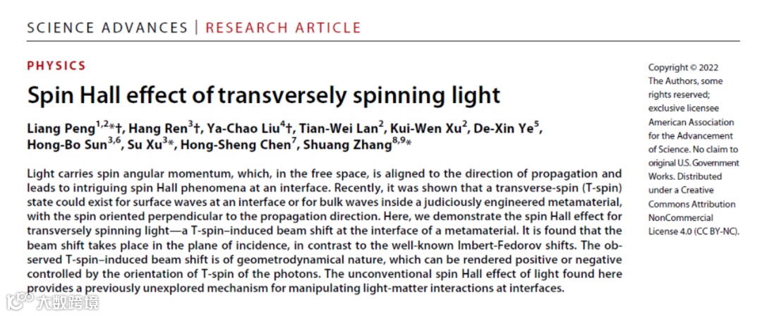自旋是光子的基本属性之一,其表现为电磁波的电场或磁场量随时间发生旋转。光子的自旋霍尔效应则代表一种物理现象,具体为具有自旋属性的光子束在经历界面反射或者折射时发生波束中心的侧向位移。通过研究和操控光子自旋霍尔效应,可以实现光子定性检测、光子筛选、光子相位调控、实现光子分路器、光子边缘成像等,因而在光子器件、光子系统等方面具有潜在的广泛应用。
