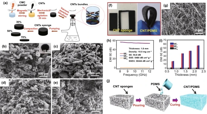 图3. (a) 不同压实比CNTs海绵的制备工艺图;(b-e) 不同压实比下CNTs海绵的SEM图;(f) CNTs海绵照片;(g) CNTs海绵的SEM图;(h) CNTs海绵在X波段的EMI屏蔽效应;(i) 不同厚度CNT海绵的平均SET、SER、SEA;(j) CNT/PDMS纳米复合材料的制备示意图。
