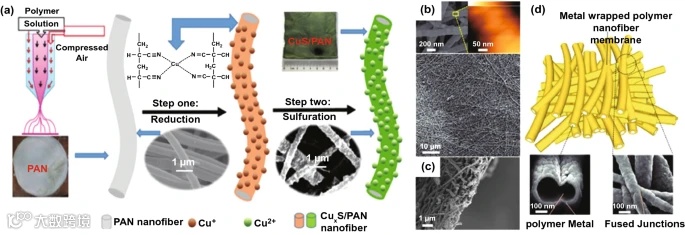 图8. (a) CuxS/PAN纳米纤维毡制备示意图; (b) SEM和AFM图像; (c)毡膜截面的SEM图; (d)胞膜示意图和微观结构图。