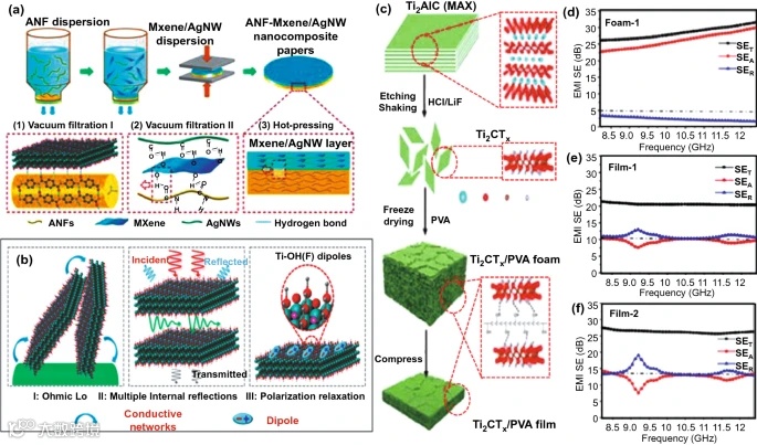 图7. (a)双层ANF MXene/AgNW纳米复合纸制备示意图; (b)双层纳米复合纸的EMI屏蔽机理; (c) Ti₂CTₓ/聚乙烯醇(PVA)复合泡沫和薄膜的制备示意图; (d) MXene/PVA复合材料的EMI屏蔽机理; (e,f) Ti₂CTₓPVA 的EMI屏蔽性能。