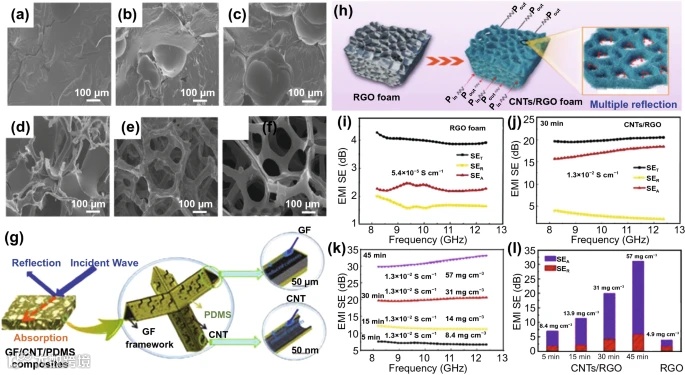 图4. (a-e) GF/PDMS复合材料SEM图;(f) 石墨烯层SEM图;(g) GF/CNT/PDMS杂化复合材料EMI屏蔽的示意图;(h) CNTs/还原氧化石墨烯(RGO)泡沫复合材料的EMI屏蔽机理图;(i,j) RGO和CNTs/RGO泡沫复合材料的SET、SEA、SER;(k) CNTs/RGO泡沫复合材料的SET、导电性和密度;(l) RGO和CNTs/RGO泡沫复合材料的平均SEA和SER。