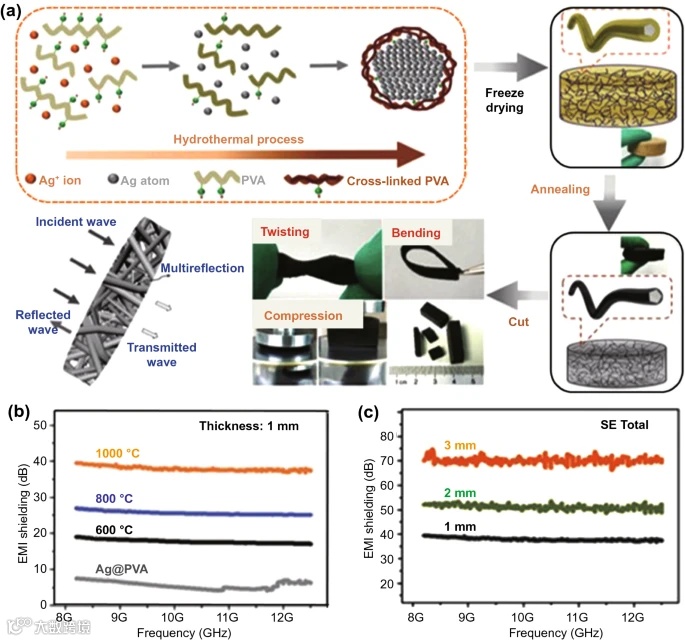 图6. (a) 银线包覆碳(Ag@C)芯-壳杂化海绵制备示意图; (b-c) 不同厚度和SET的Ag@C-1000海绵的EMI屏蔽性能。
