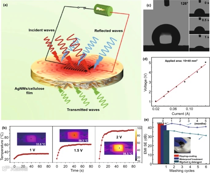 图10. (a) 多功能柔性AgNWs/纤维素膜示意图; (b) 焦耳加热性能; (c) 未涂硅酮(右)和涂有硅酮(左)的M型纺织品和的水接触角测量; (d) 有机硅涂层M织物的I–V曲线;(e) 防水处理对EMI屏蔽性能稳定性的影响。